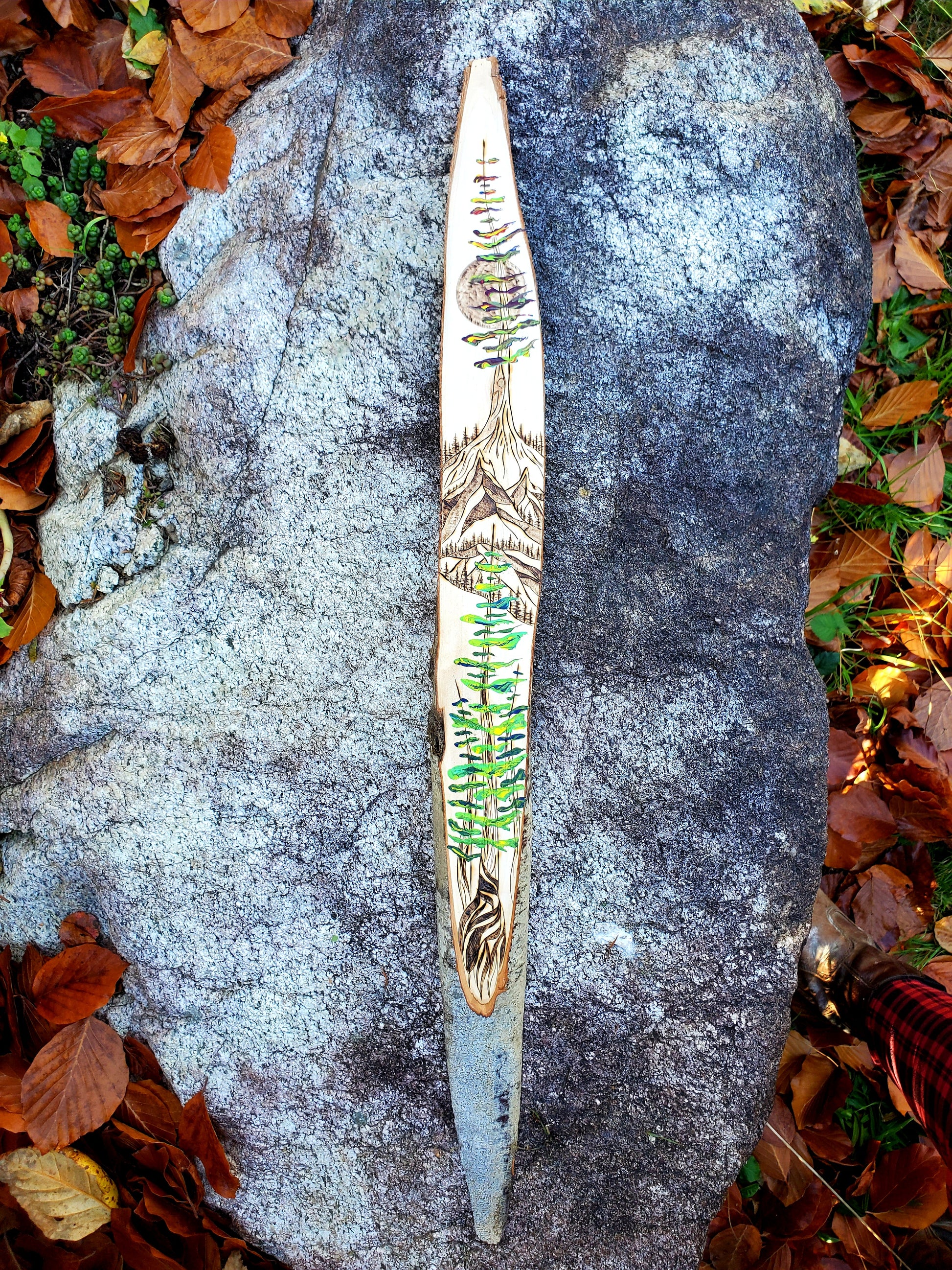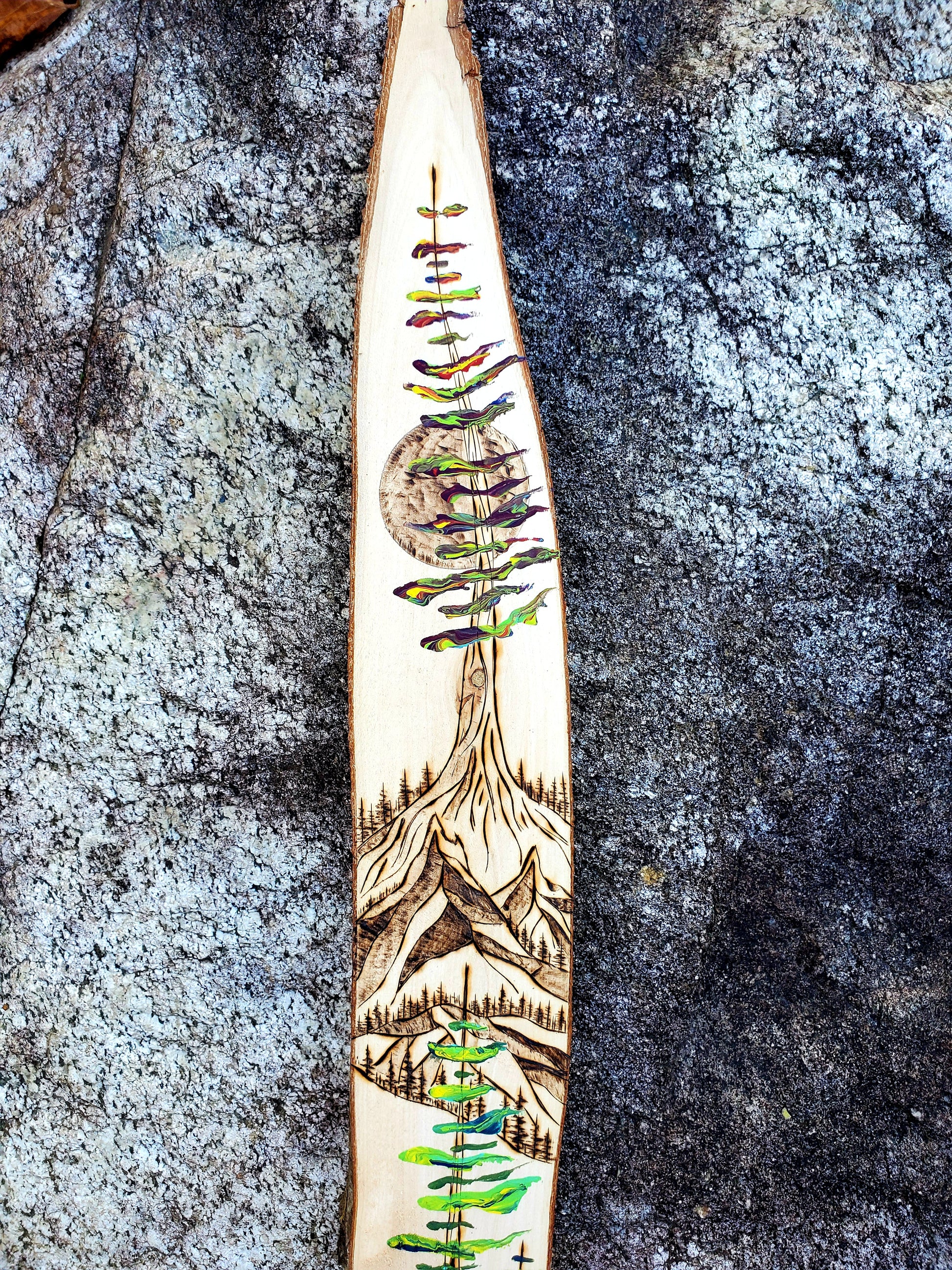 Original hand drawn wood burning with acrylic on red alder slab. Full moon rising over mountains behind towering trees strongly rooted in the earth.