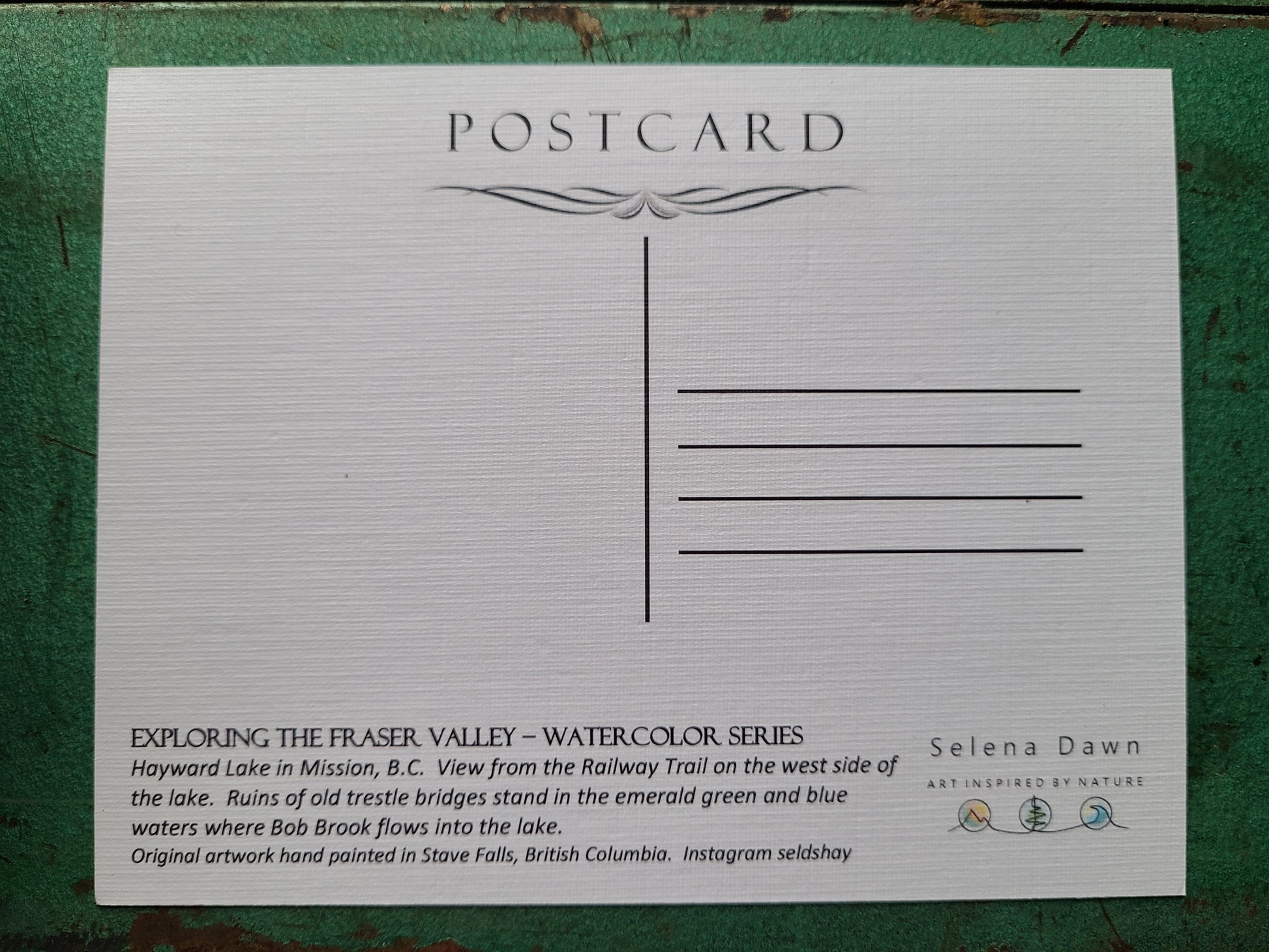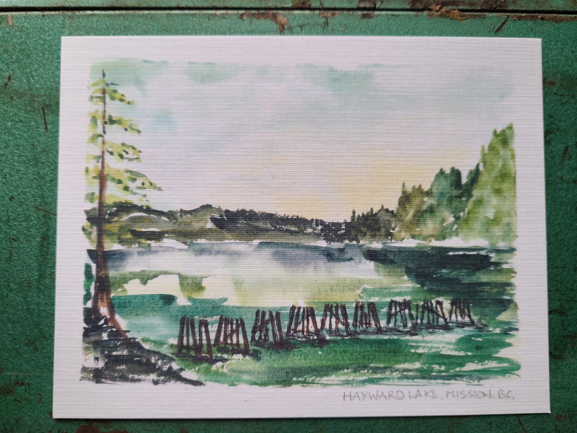Postcard with my original and hand painted watercolor artwork inspired by places in the Fraser Valley.