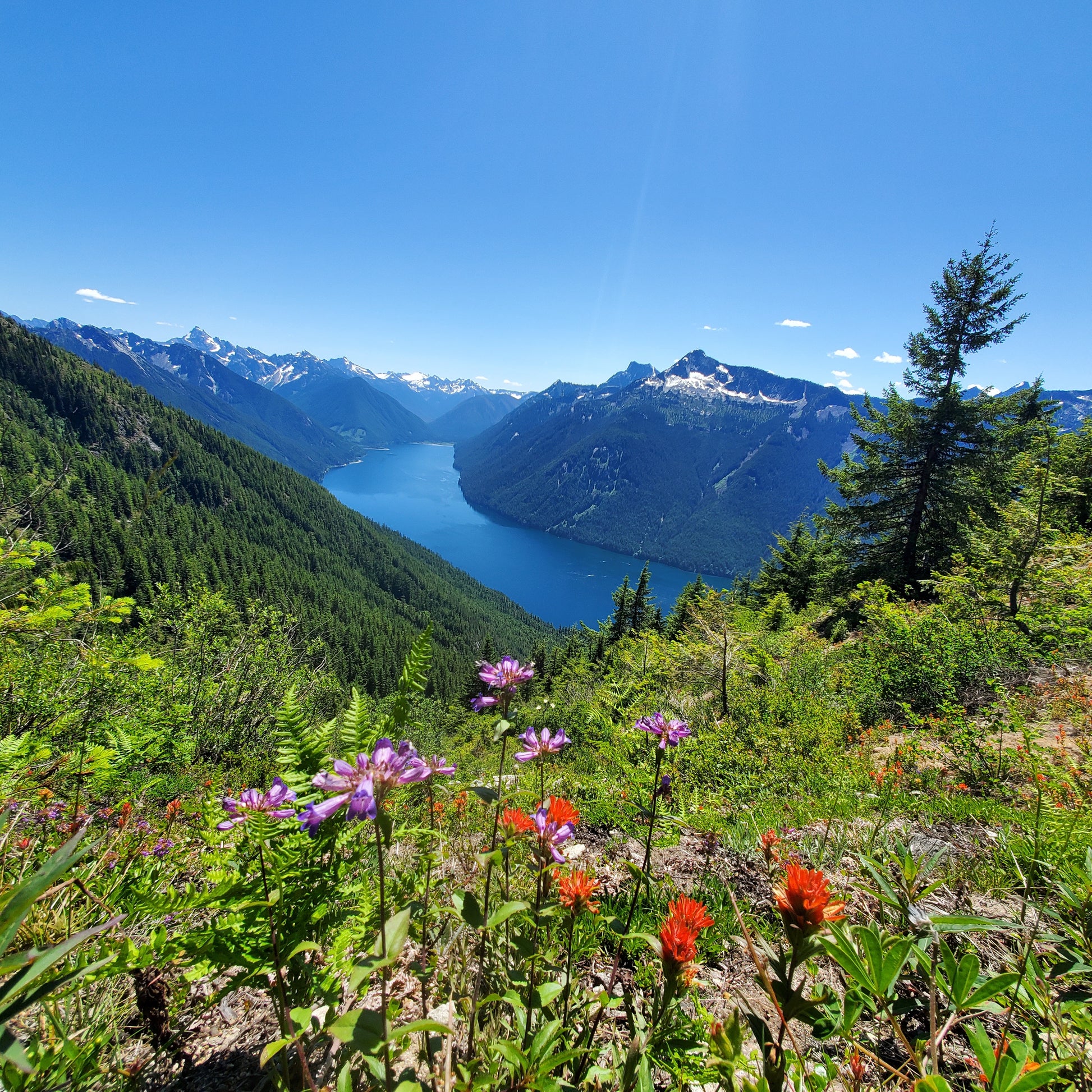 Flora Peak is one of my favorite places to hike and to paint. This particular painting is inspired by the trail segment that overlooks Chilliwack Lake. In the spring the trail is vibrant with reds, purples, and orange wildflowers.