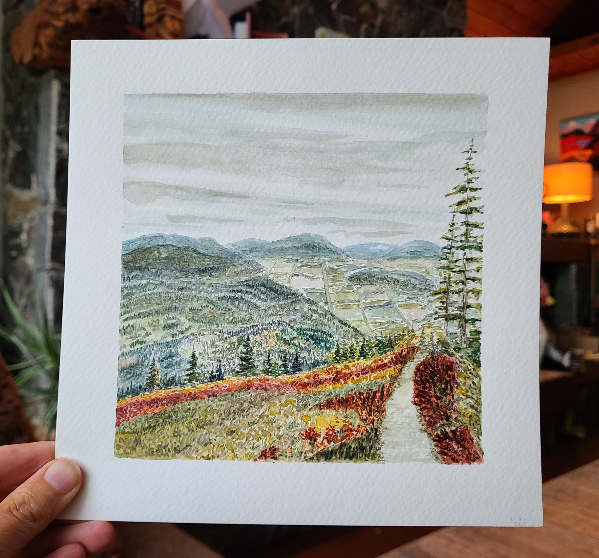 Everytime I hike Elk I stop at this spot on the trail and look west at the view of the Fraser Valley. I am also always drawn to the cluster of wind swept fir trees. This painting was from a hike I did during the fall when there were rich burgundy and orange foliage dotting the trails.