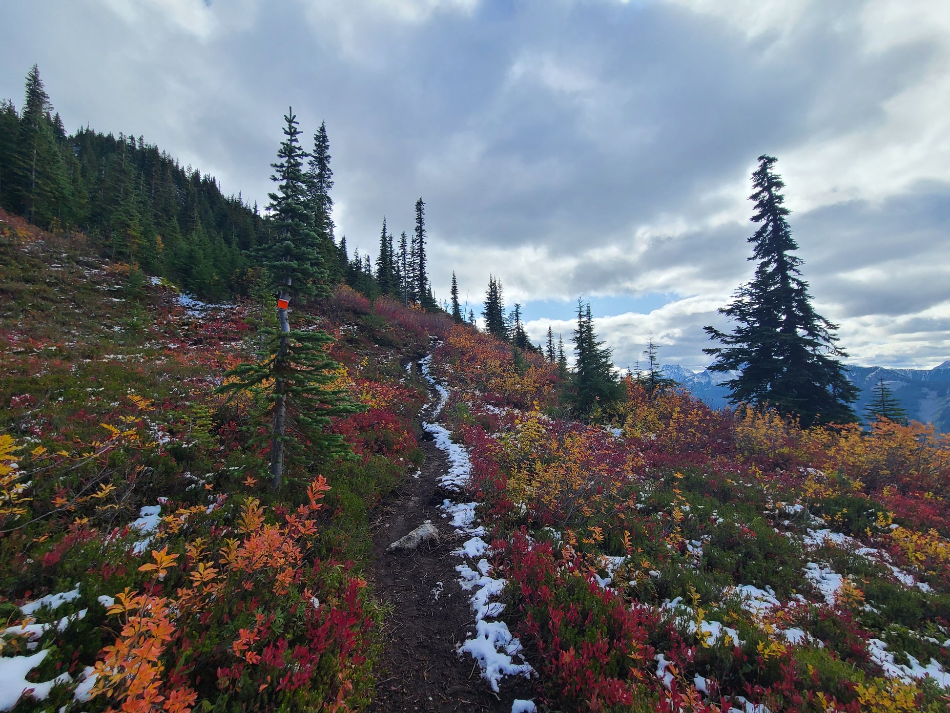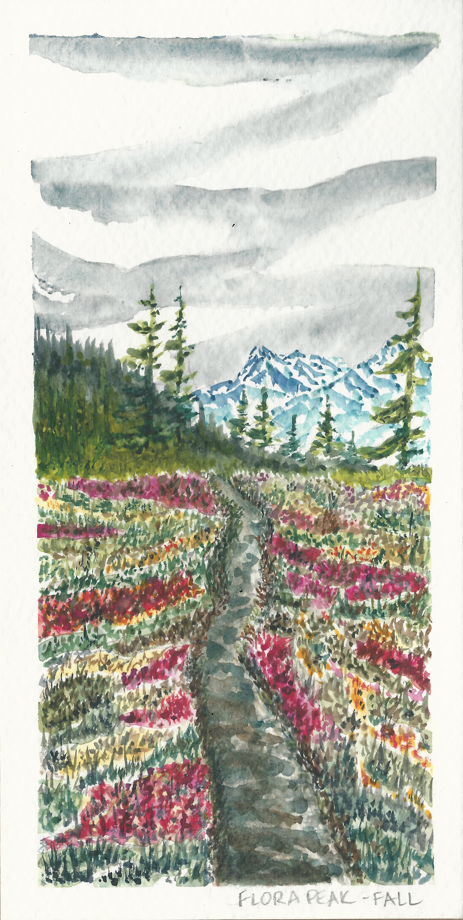 Flora is one of my favorite hikes and places to paint. This particular watercolor is inspired by the trail segment near the start of the final ascent of Flora Peak. In September and October the trail is dotted with vibrant fall colors.