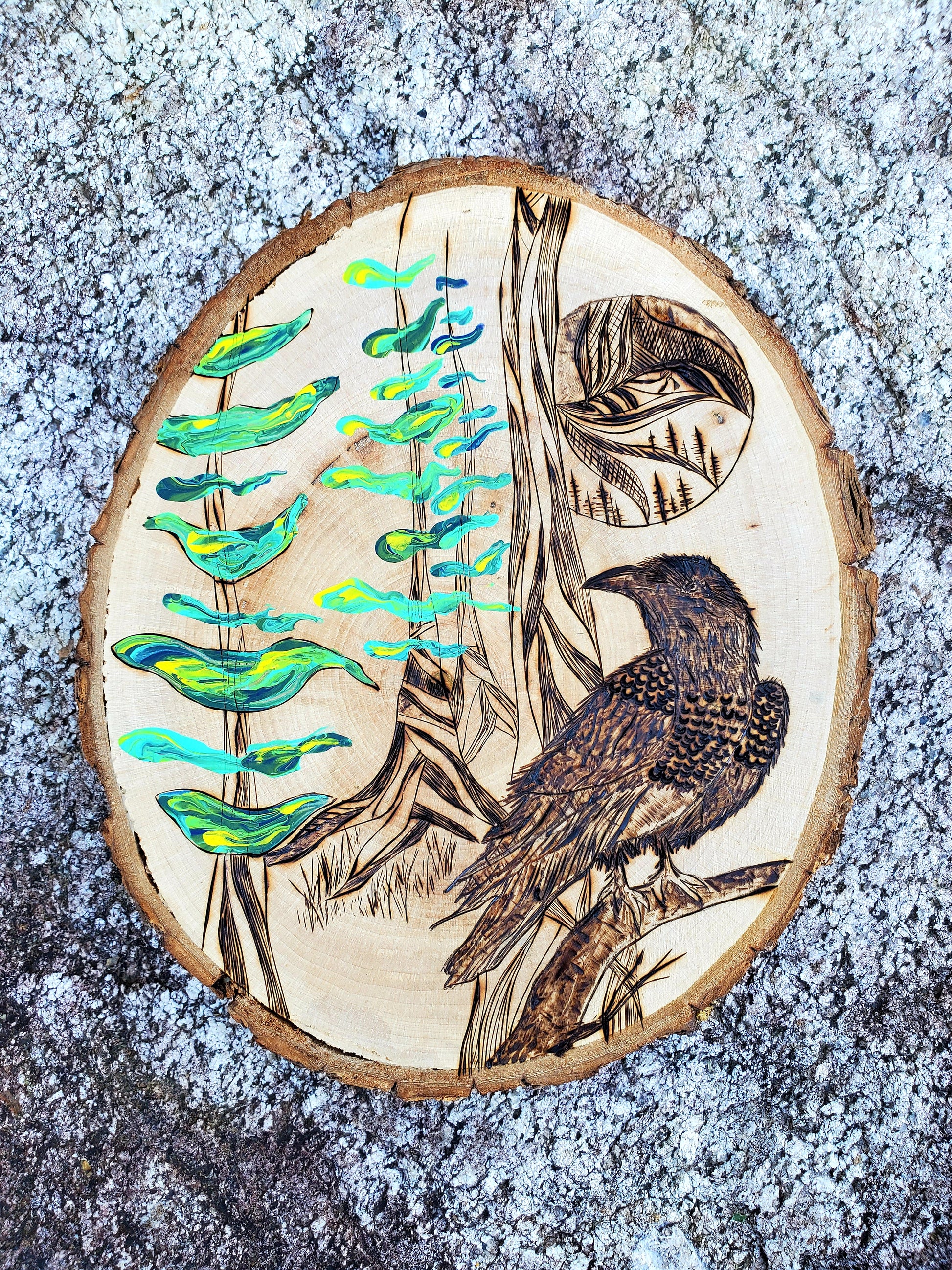 "Forest for the Trees". Free hand wood burning on red alder round. Raven in forest with full moon rising. Accented with acrylic paint. Approximate dimensions 6" x 7" x 0.5" thick. Signed and titled on back. Hanger affixed.